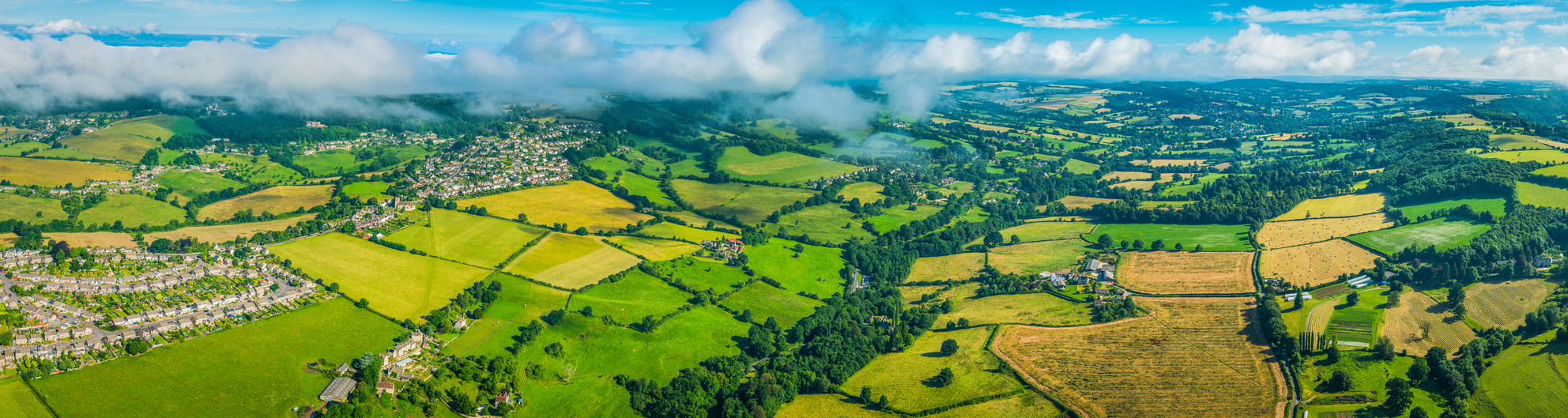 • A picturesque countryside with rolling hills covered with patchwork fields, crystal clear rivers and streams